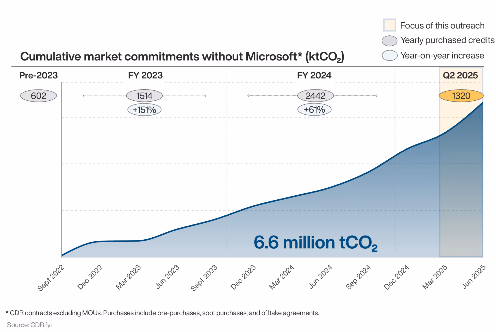 Even excluding Microsoft’s substantial transactions, the CDR market has expanded significantly in H1 this year, with 2,020 kt purchased. Q2 alone saw 1,320 kt of new contracts (without Microsoft), representing a robust 234% year-on-year growth compared to Q2 2024.
