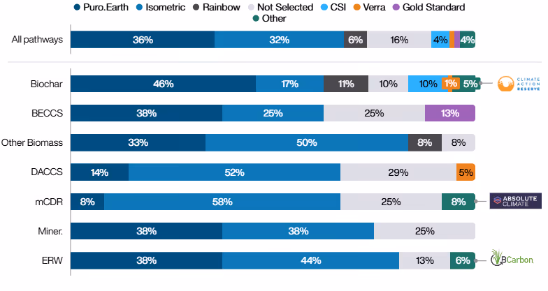Puro.earth and Isometric currently lead registry selection with 36% and 32%, respectively, while newer registries such as Rainbow (6%) are also starting to gain exposure within the durable CDR market.