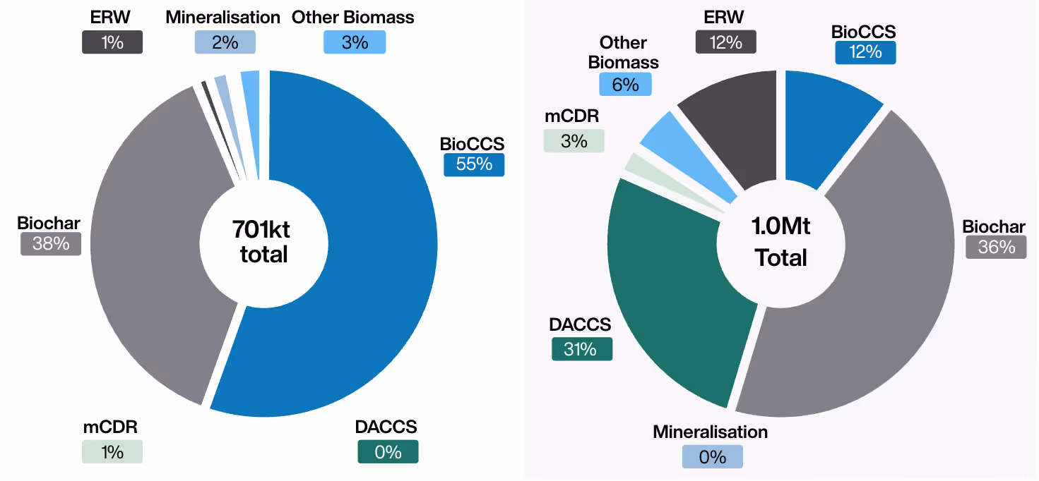 Biochar's lower barriers to entry have enabled faster commercial deployment, though project quality remains heterogeneous. Meanwhile, DACCS shows the widest distribution of development stages, reflecting a pathway transitioning from demonstration to commercial scale, supported by stronger buyer interest.