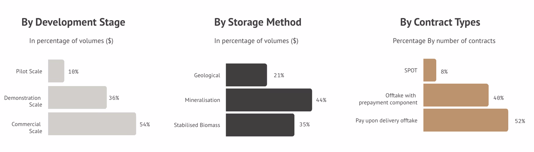 A review of the project's development stages reveals that a majority has already transitioned to operational status or achieved commercial deployment, while a few of them had only operated at the pilot stage. This reflects the variety of buyers' needs and objectives regarding their CDR strategy.