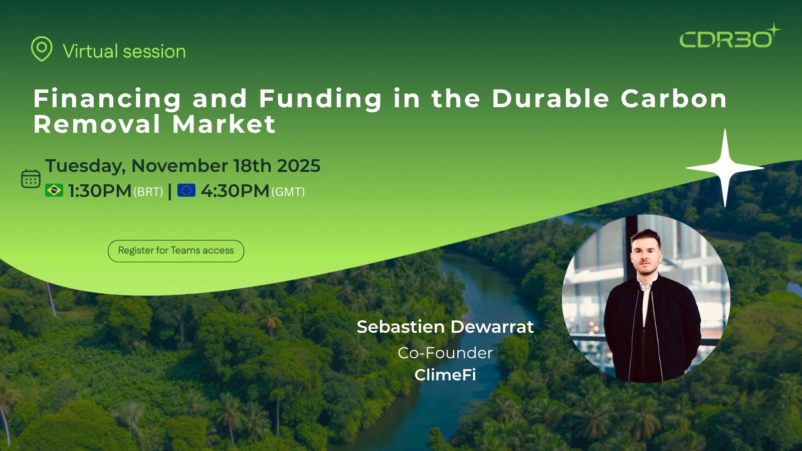 ClimeFi will host a session at CDR30 Pavilion, COP30, titled “Financing and Funding in the Durable Carbon Removal Market” where Sebastien Dewarrat, Co-Founder of ClimeFi, will share insights on the rapid CDR market expansion, emerging capacity, and current state of supply.